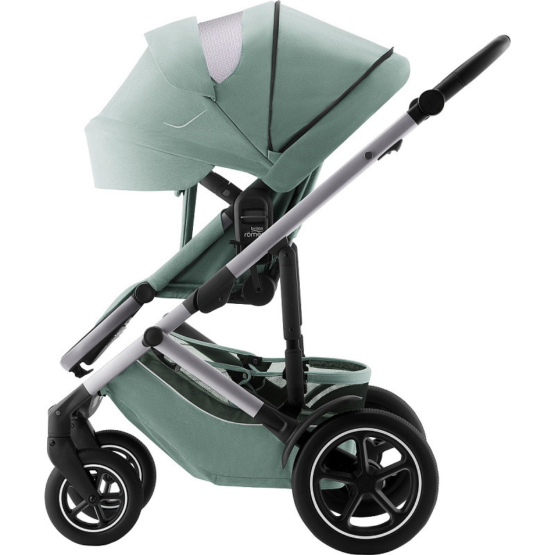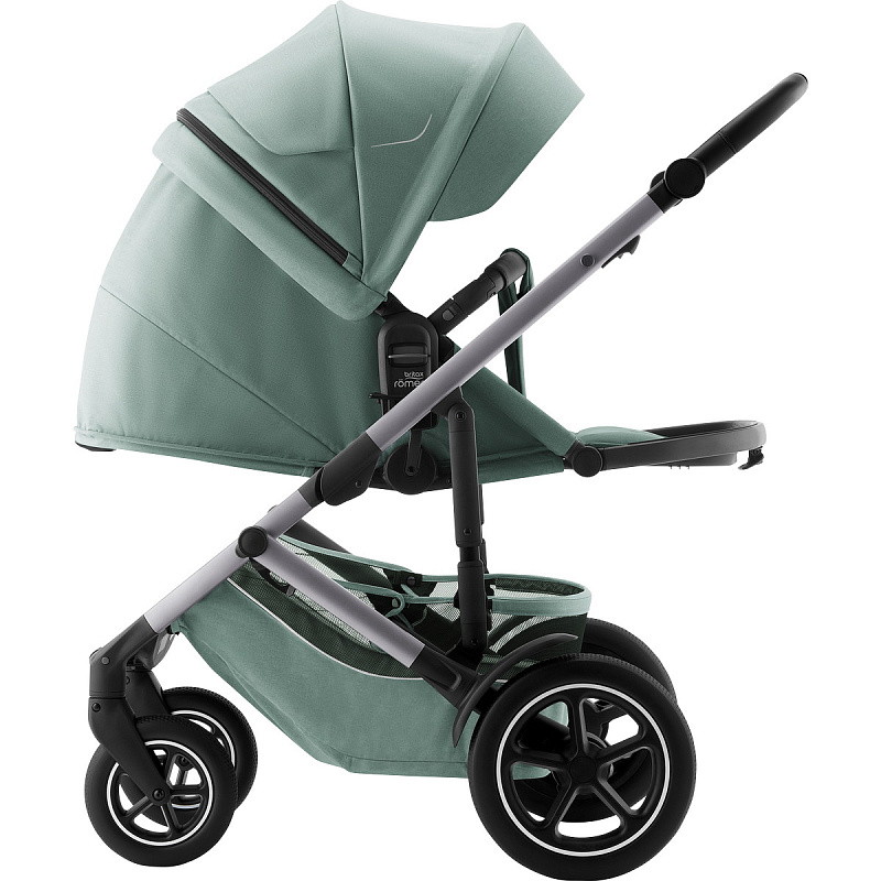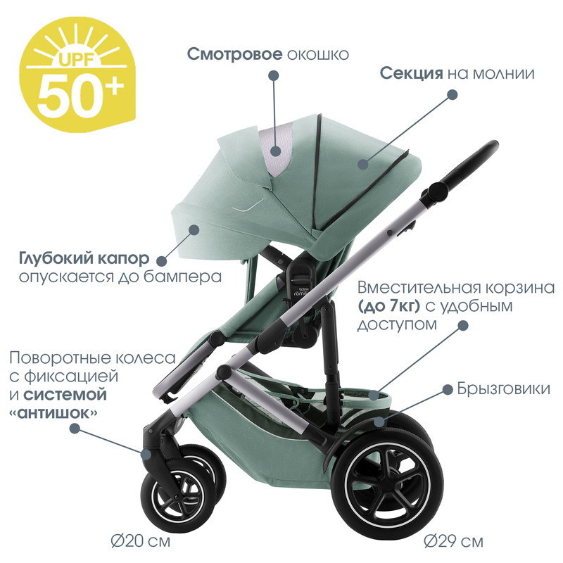 Устанавливается штатным ремнем или на поворотную базу Britax Roemer, а также совместима с большинством прогулочных колясок.
