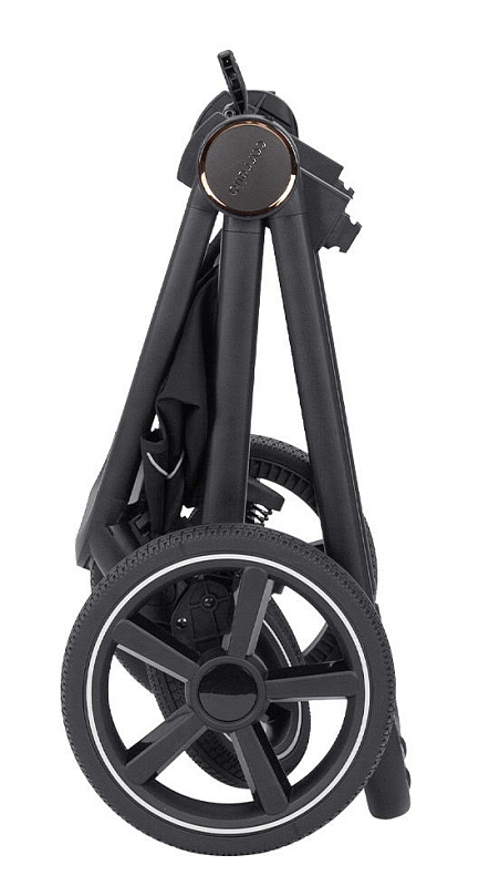 Рама у коляски BLACK и регулируемой в четырех положениях родительской ручкой, обтянутой эко-кожей премиум класса с тиснением логотипа.