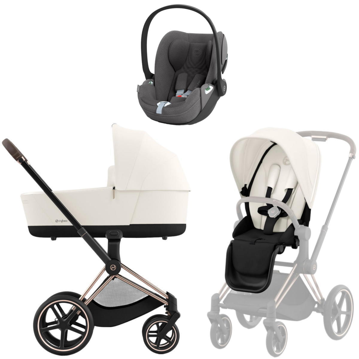 Коляска 3 в 1 Cybex Priam IV Rosegold complete и автокресло Cloud T i-Size Mirage Grey Plus Off White