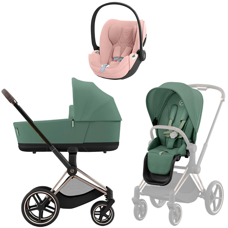 Коляска 3 в 1 Cybex Priam IV Rosegold complete и автокресло Cloud T i-Size Peach Pink Plus Leaf Green