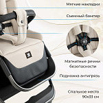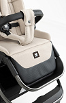 Прогулочный блок коляски имеет 3 регулируемых положения спинки и большой капюшон с дополнительной секцией и козырьком. Он защищает кроху от солнца и ветра, полностью закрывая малыша до ножек в разложенном состоянии. Магнитные пятиточечные ремни безопасности гарантируют надежную фиксацию маленького пассажира и удобно регулируются по росту. Бампер из экокожи, с паховой перемычкой, легко отстегивается с обеих сторон для удобства.