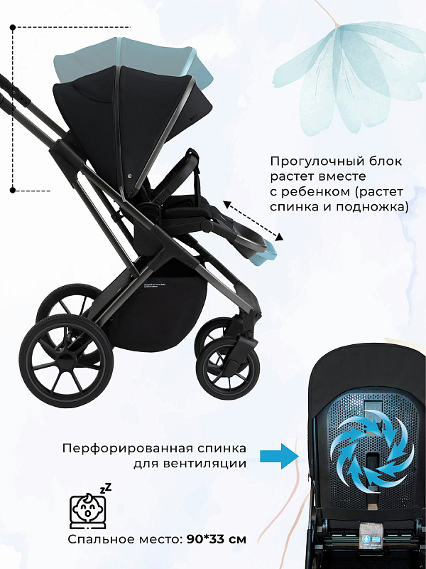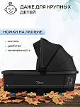 Подножка прогулочного блока регулируется в 3 положениях и раздвигается в длину, чтобы ребенку было максимально комфортно. Коляска поставляется в комплекте, который включает в себя шасси, прогулочный блок, люльку, дождевик, накидку на ножки и сумку-трансформер.