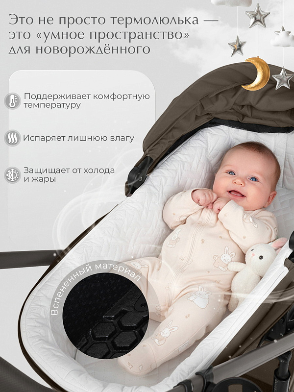 - Термолюлька нового поколения 85х43х66 см, которая обеспечивает оптимальную температуру внутри и обладает отличной теплоизоляцией - малышу комфортно в любых погодных условиях и служит барьером от внешнего мира: