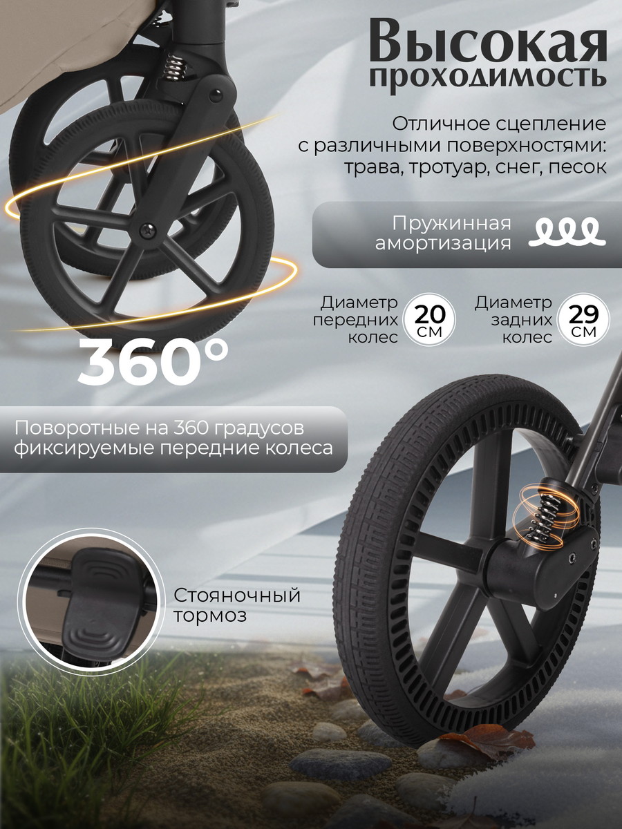 Теперь вы можете спокойно путешествовать с малышом или экономить место дома, не идя на компромисс с комфортом и безопасностью вашего крохи! Большие колеса с амортизацией диаметром 29 и 20 см обеспечивают исключительную проходимость по любым дорогам — от городских тротуаров до зимних снегов и грязи.