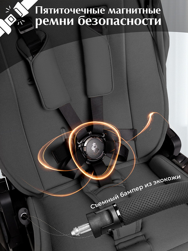 Регулируемые магнитные ремни безопасности с мягкими накладками и бампер из экокожи обеспечивают максимальную защиту и комфорт. Накидка с доступом к ребенку с молнией по центру защищает в прохладную погоду