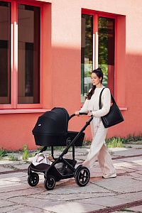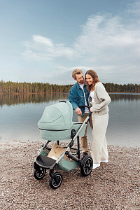 - С помощью поворотных передних колёс можно легко маневрировать во время городских прогулок, а для комфортного путешествия по пересеченной местности их можно зафиксировать. Передние колёса с амортизацией компенсируют неровности дороги, поэтому вы можете открывать мир своему малышу, гуляя с ним и по брусчатым мостовым, и по размокшим грунтовым дорогам.