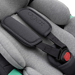 Безопасность маленького пассажира обеспечивают поворотный откидной бампер и пятиточечные ремни с мягкими накладками. Ремни регулируются по высоте в соответствии с ростом ребёнка, а бампер выполнен из качественной экокожи. Верхние ремни можно отстегнуть, но полностью убирать их нельзя — они пришиты к спинке сиденья.