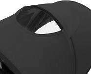 Особенность прогулочного блока коляски Agex Life — большой капюшон, который закрывает малыша до ног в сидячем положении. Ребёнок защищён от дождя и ветра. Чтобы полностью закрыть ребёнка, нужно максимально раскрыть капюшон. Для удобства наблюдения за малышом предусмотрено смотровое окно со шторкой на магнитах.