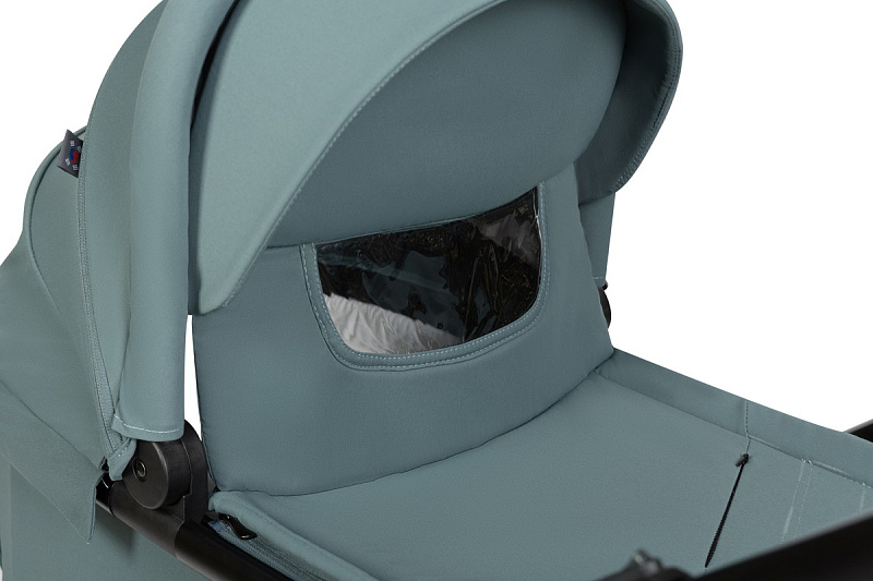 Особенность прогулочного блока коляски Agex Play — большой капюшон, который закрывает малыша до ног в сидячем положении. Ребёнок защищён от дождя и ветра. Чтобы полностью закрыть малыша, нужно максимально раскрыть капюшон. Для удобства наблюдения за малышом предусмотрено смотровое окно со шторкой на магнитах.