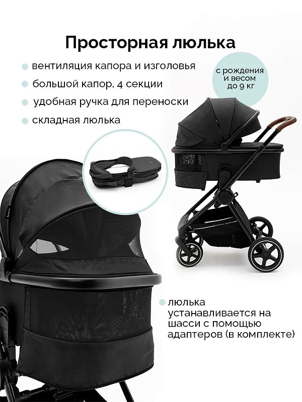 Просторная люлька с мягким матрасиком создаст у новорождённого ощущение нахождения у мамы на руках. Для защиты от солнца и ветра капюшон можно расширить, а для дополнительной циркуляции воздуха предусмотрена вентиляция капора и изголовья. Люлька компактно складывается, что облегчает хранение и транспортировку.