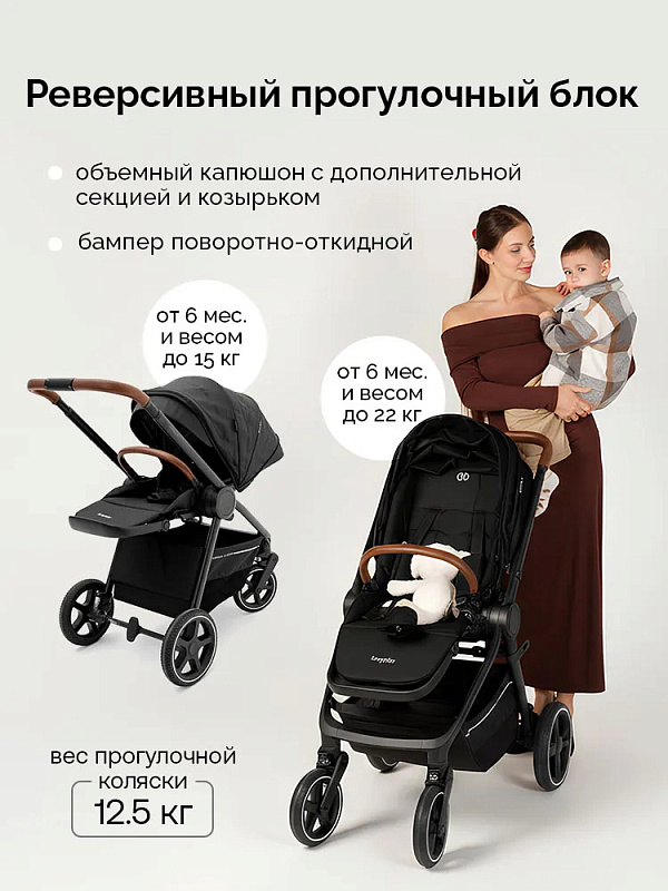 Реверсивный прогулочный блок может быть установлен как по ходу, так и против хода движения. Объемный складной капюшон оснащен защитой UPF50 +, который может быть расширен для максимальной защиты малыша в солнечные дни.