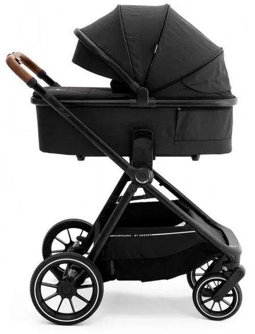Уникальность коляски в высоком расположении люльки и сиденья, что обеспечивает оптимальную близость и контакт между родителем и ребенком. Телескопическая ручка регулируется на несколько положений по высоте, создавая комфорт на прогулках и невысокой маме, и высокому папе. Объемный складной капюшон оснащен защитой UPF50 +, который может быть расширен для максимальной защиты малыша в солнечные дни.