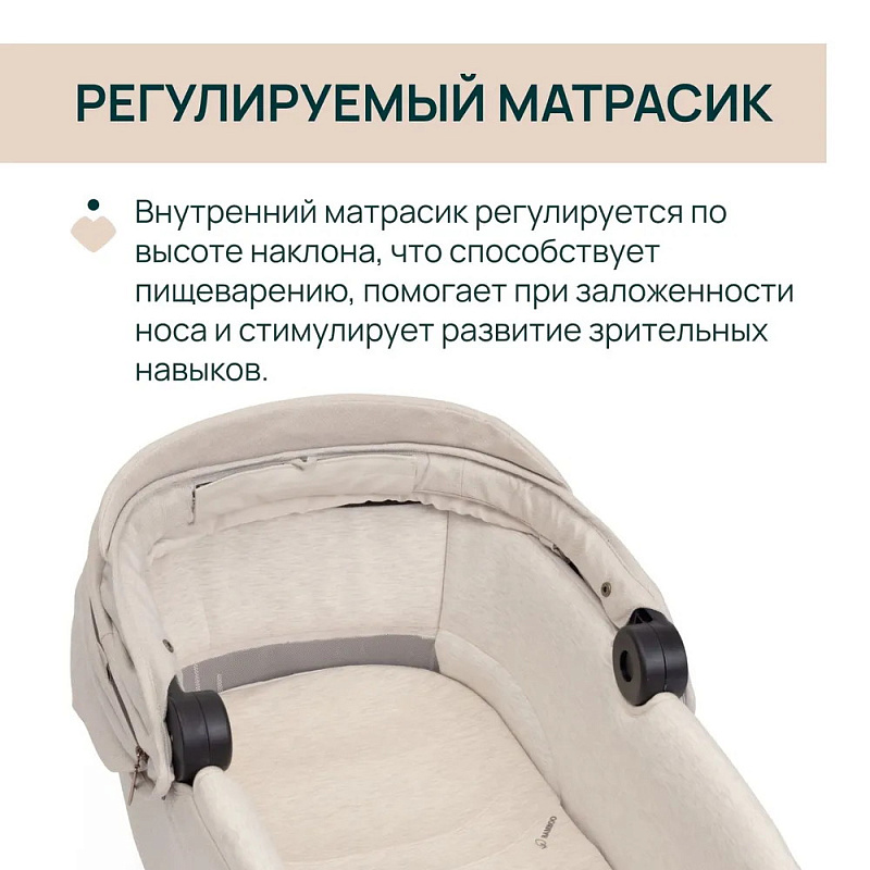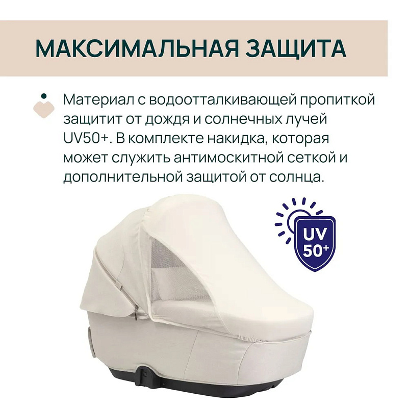 Капюшон люльки увеличивается в размере и имеет защиту от ультрафиолетовых лучей UV50+ и водоотталкивающее покрытие. Встроенный солнцезащитный козырек обеспечивает защиту ребенка от солнечных лучей и укусов комаров.