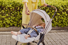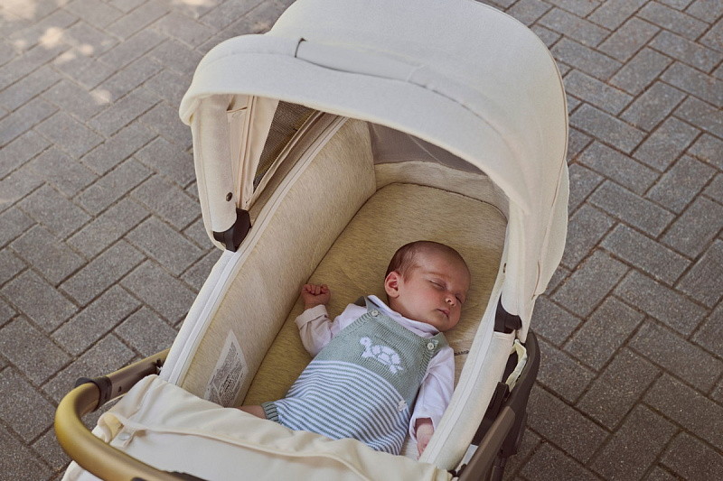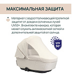 Капюшон люльки увеличивается в размере и имеет защиту от ультрафиолетовых лучей UV50+ и водоотталкивающее покрытие. Встроенный солнцезащитный козырек обеспечивает защиту ребенка от солнечных лучей и укусов комаров.