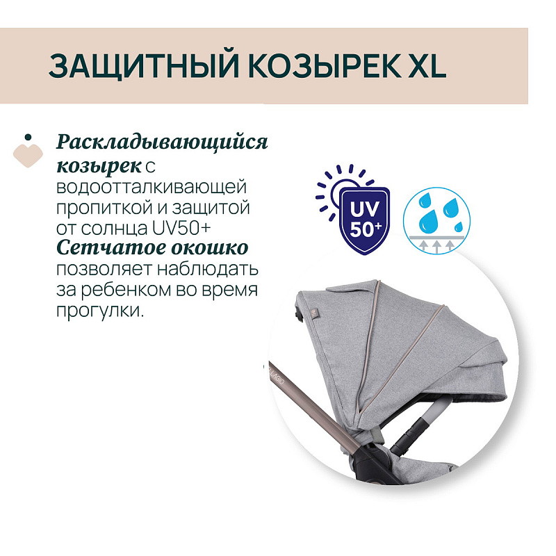 Выдвижной защитный капюшон XL оснащен защитой от ультрафиолета UV50+ и водостойкостью. Он также имеет сетчатое окошко, чтобы всегда поддерживать зрительный контакт с ребенком.
