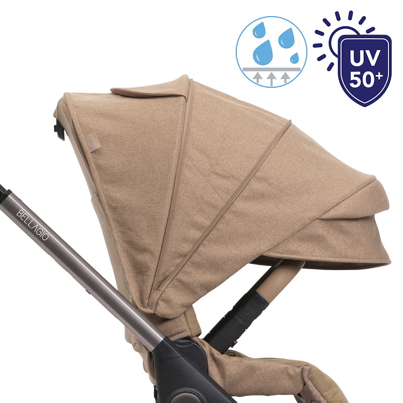 Капюшон люльки увеличивается в размере и имеет защиту от ультрафиолетовых лучей UV50+ и водоотталкивающее покрытие. Встроенный солнцезащитный козырек обеспечивает защиту ребенка от солнечных лучей и укусов комаров.