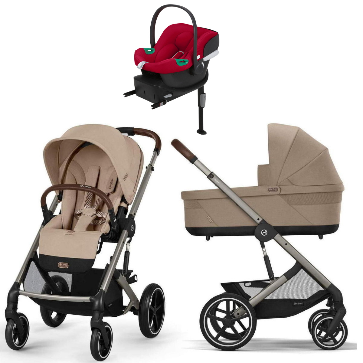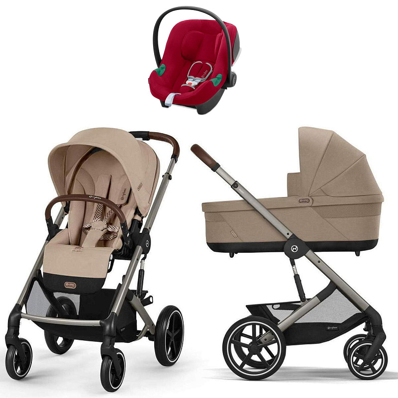 Коляска Cybex Balios S Lux TPE complete Aton B2 Dynamic Red Base One 4 в 1 Almond Beige с дождевиками