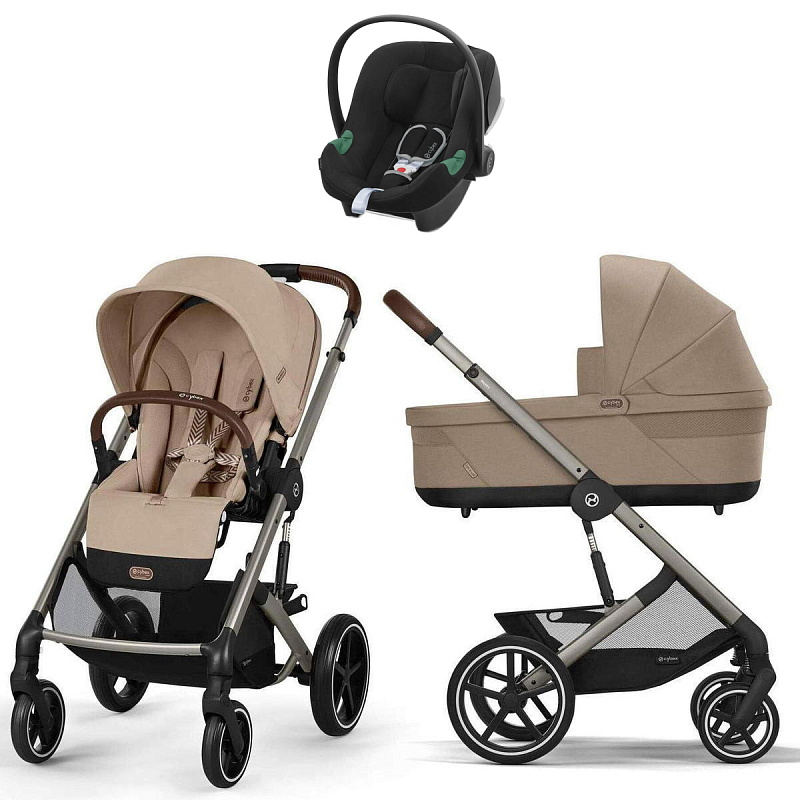 Коляска Cybex Balios S Lux TPE complete Aton B2 Volcano Black Base One 4 в 1 Almond Beige с дождевиками