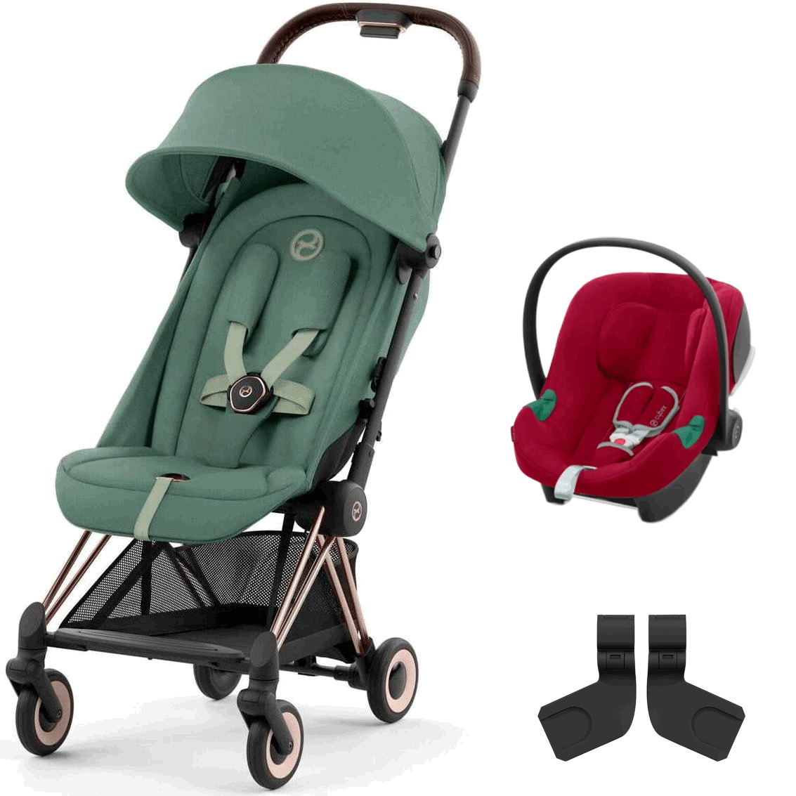 Коляска Cybex Coya Rosegold Frame Aton B2 i-Size Dynamic Red Leaf Green с дождевиком и бампером