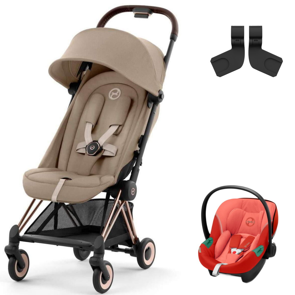Коляска Cybex Coya Rosegold Frame Aton S2 i-Size Hibiscus Red Cozy Beige с дождевиком и бампером