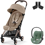 Коляска Cybex Coya Rosegold Frame Cloud T i-Size Leaf Green Plus Cozy Beige с дождевиком и бампером