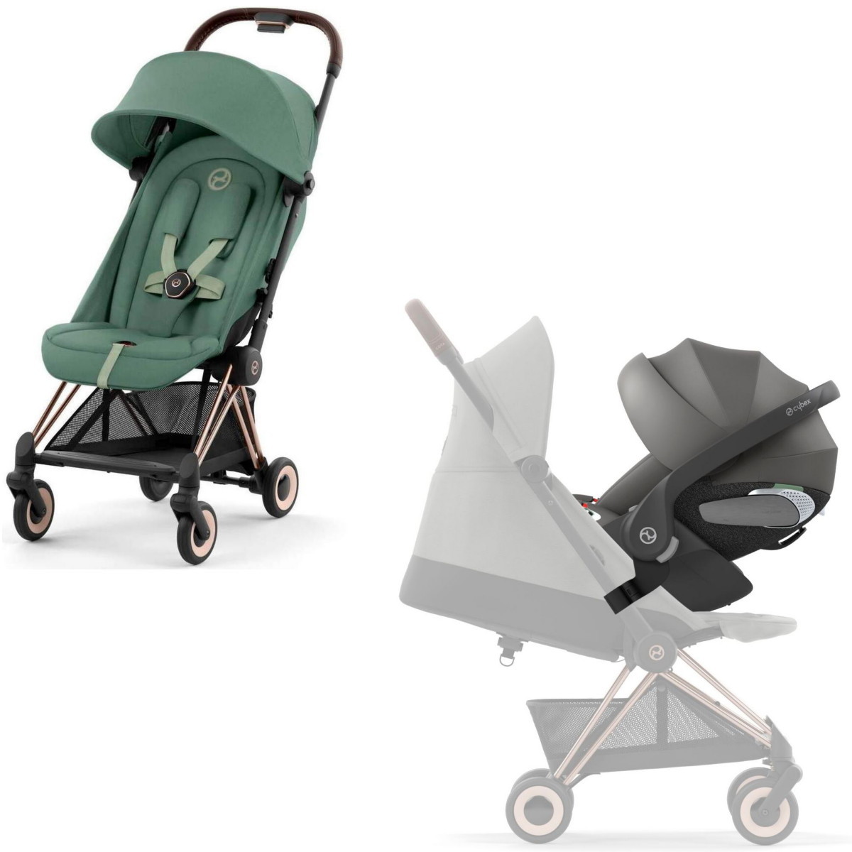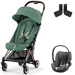 Коляска Cybex Coya Rosegold Frame Cloud T i-Size Mirage Grey Leaf Green с дождевиком и бампером