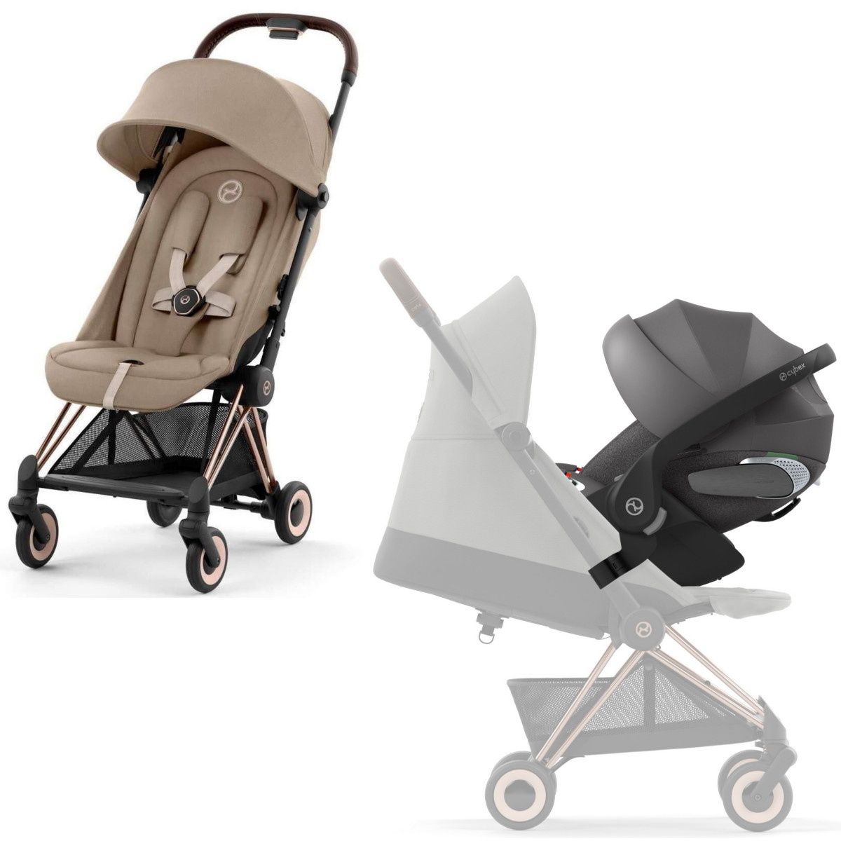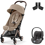 Коляска Cybex Coya Rosegold Frame Cloud T i-Size Mirage Grey Plus Cozy Beige с дождевиком и бампером