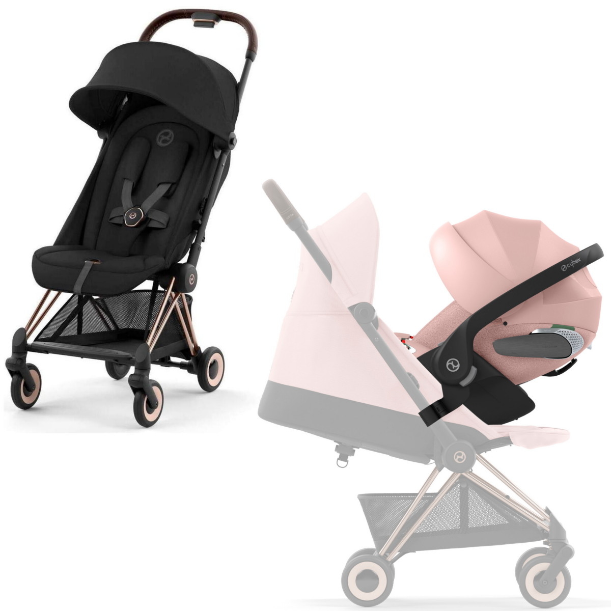 Коляска Cybex Coya Rosegold Frame Cloud T i-Size Peach Pink Plus Sepia Black с дождевиком и бампером