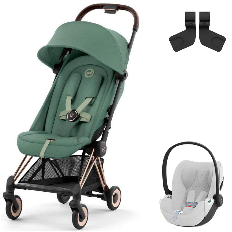 Коляска Cybex Coya Rosegold Frame Cloud T i-Size Platinum White Plus Leaf Green с дождевиком и бампером