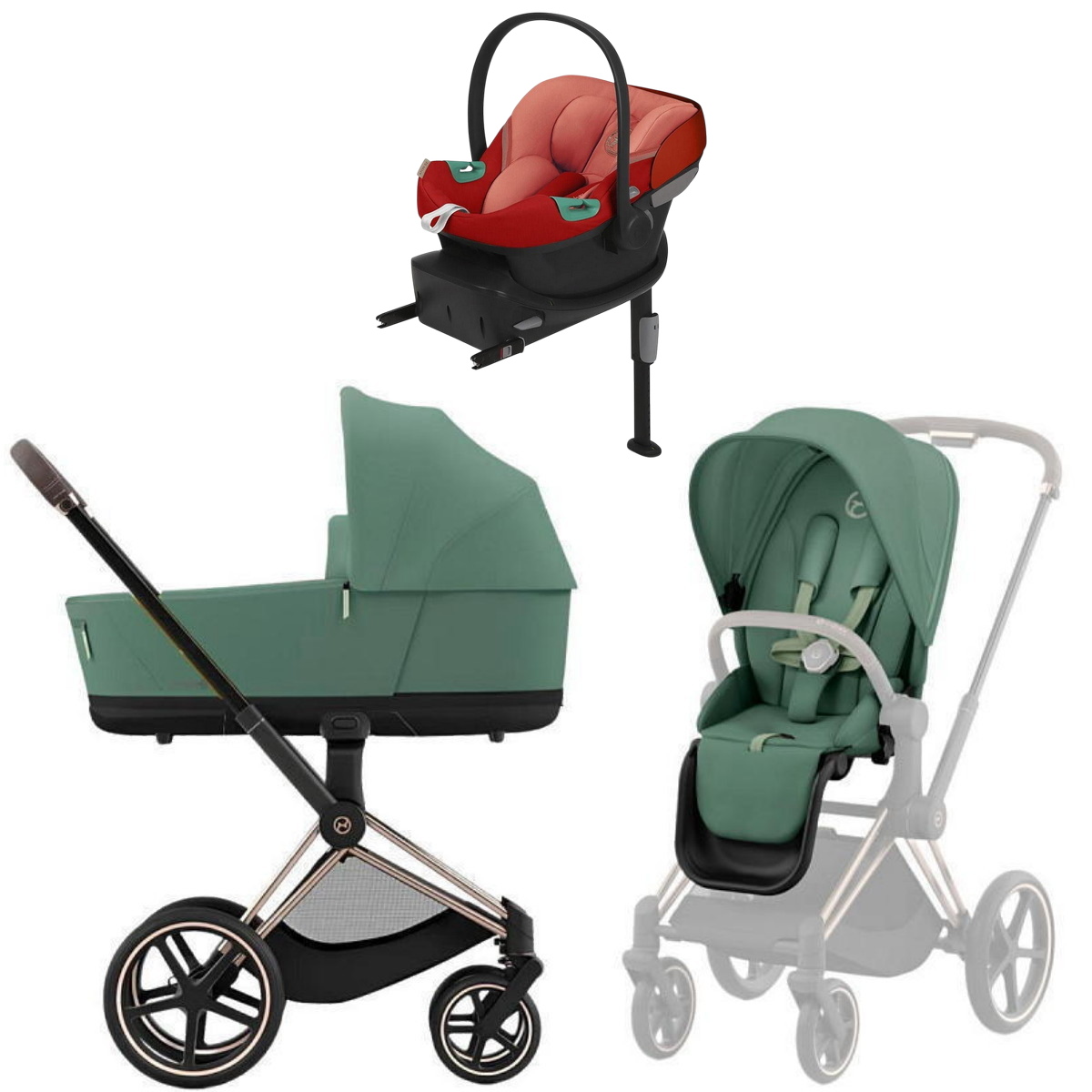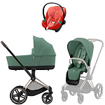 Коляска Cybex Priam IV Rosegold complete Aton S2 Hibiscus Red Base One 4 в 1 Leaf Green