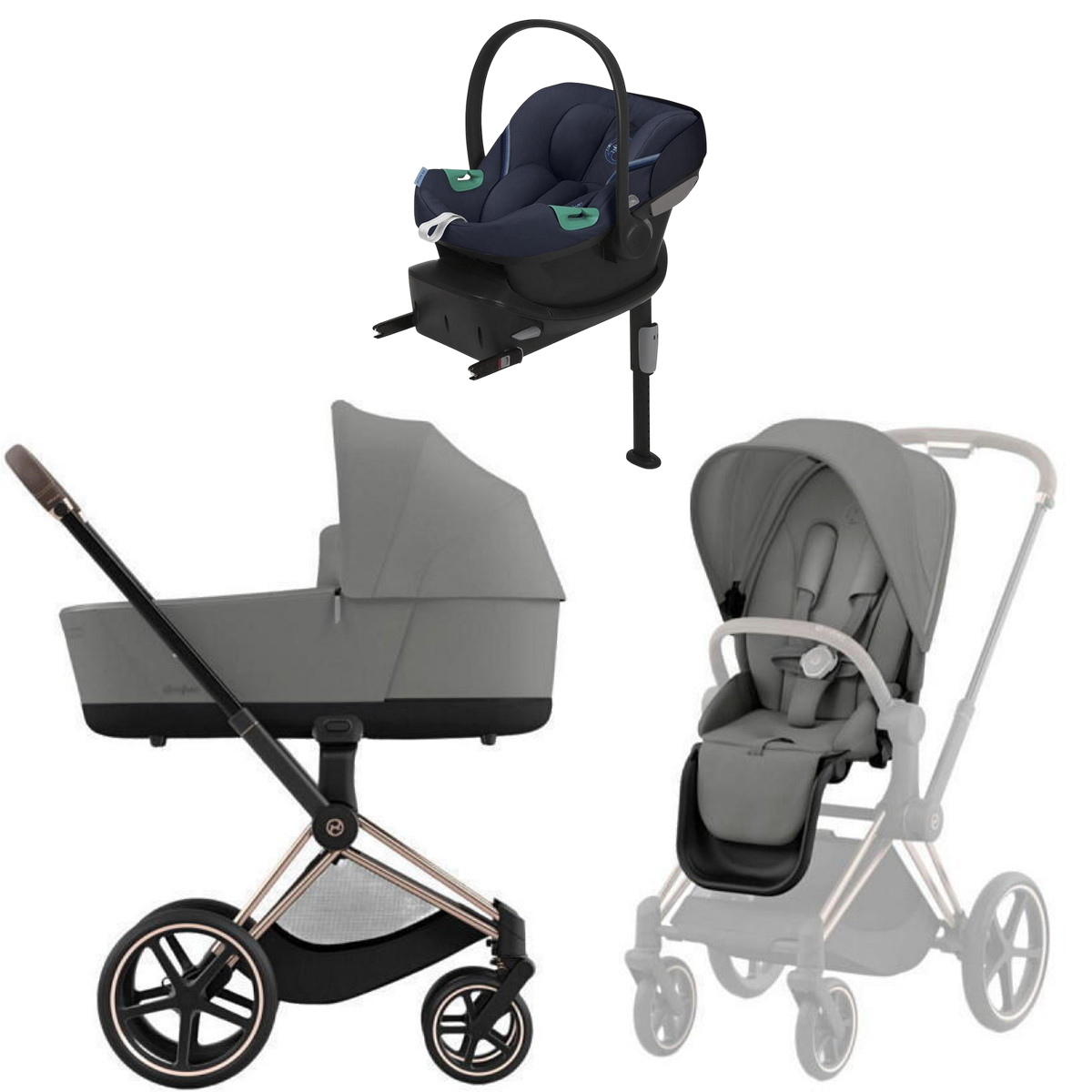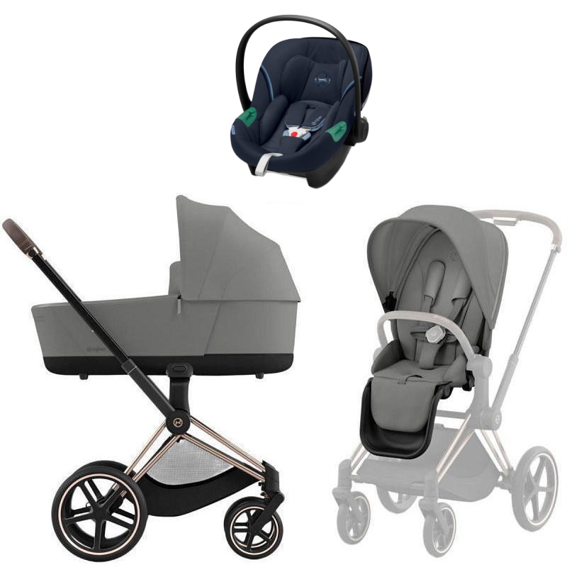 Коляска Cybex Priam IV Rosegold complete Aton S2 Ocean Blue Base One 4 в 1 Mirage Grey