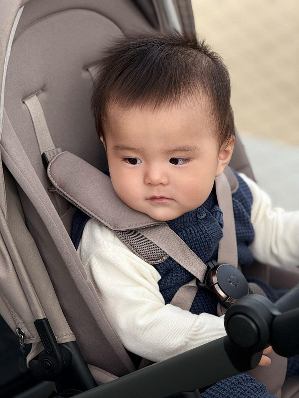 Спинка каждого сиденья легко регулируется при помощи рычажка – достаточно потянуть его и выбрать удобное положение: от сидячего до полностью лежачего. Положение подножки также можно отрегулировать – когда придет время сна, установите её в горизонт, чтобы она поддерживала ножки во время комфортного отдыха. Для безопасности предусмотрены пятиточечные ремни с мягкими накладками и магнитным замком. Бампер покрыт экокожей и легко откидывается в сторону.