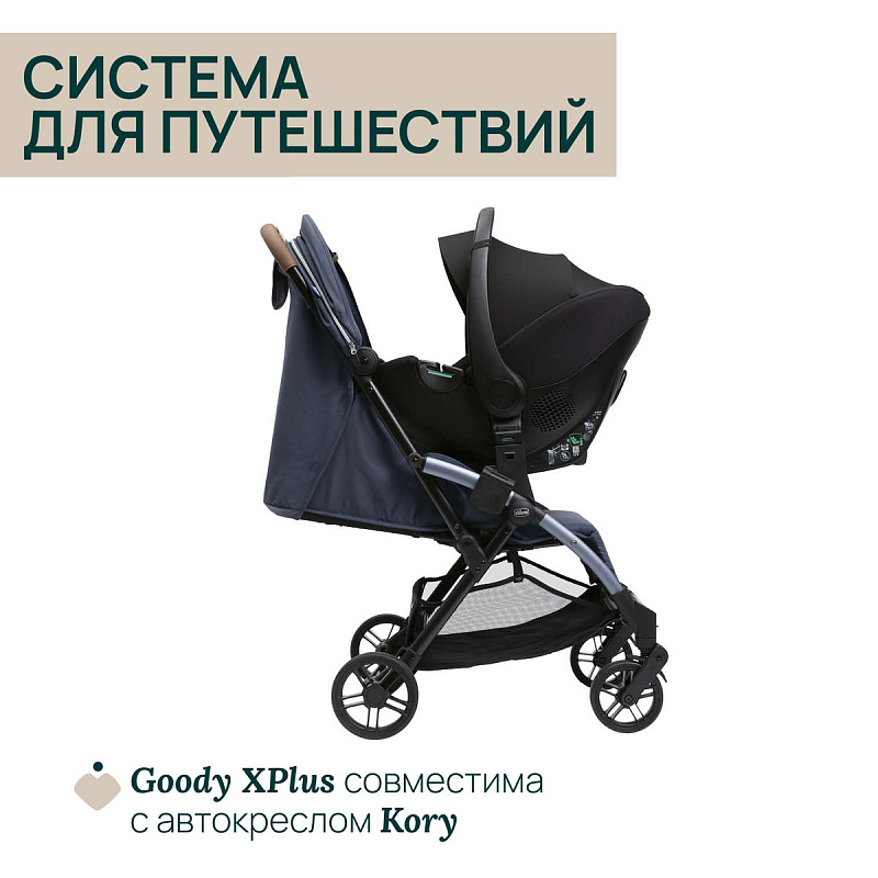 Коляска Goody XPlus легко превращается в полноценную систему для путешествий: она совместима с автокреслом Kory i-Size.