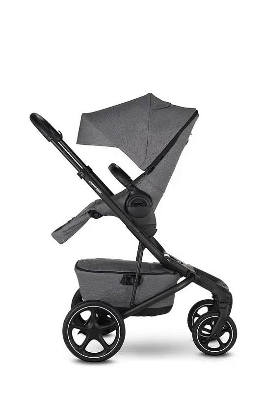 Комплектация Easywalker Jimmey включает в себя шасси с четырьмя колесами и корзину для покупок, прогулочный блок с капюшоном и бампером.