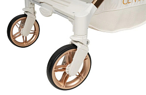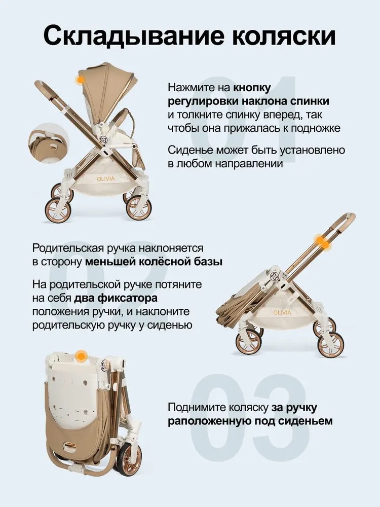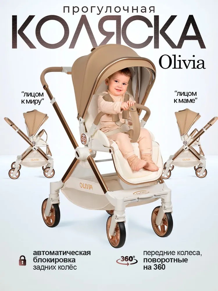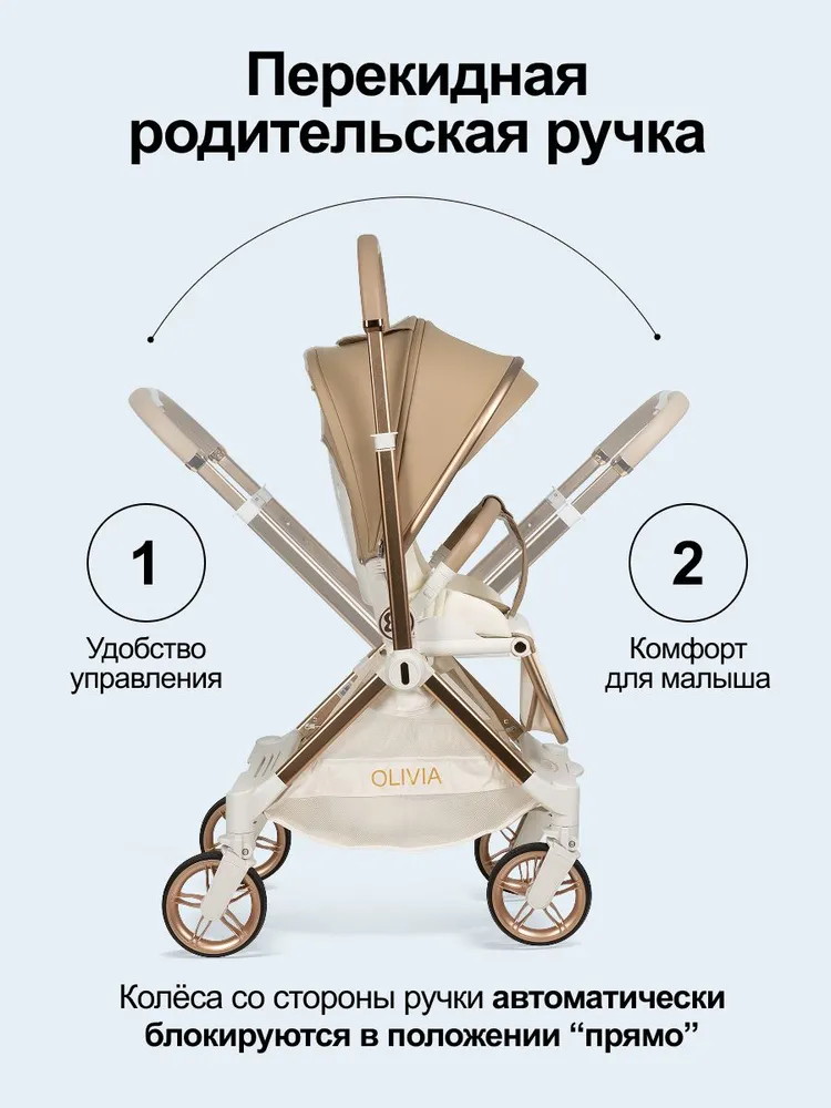 Детская прогулочная коляска Farfello Olivia с перекидной родительской ручкой. Для максимальной маневренности модель оснащена четырьмя поворотными колёсами. Для безопасности коляска дополнена ножным тормозом с обеих сторон рамы (стояночный тормоз блокирует оба задних колеса). Рукоятка родительской ручки выполнена в экокоже и регулируется по высоте в нескольких положениях позволяя подобрать оптимальную высоту под рост взрослого.