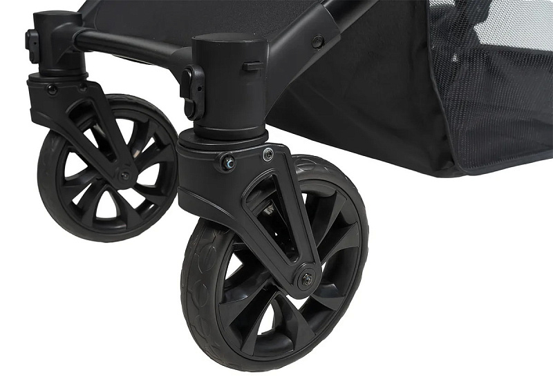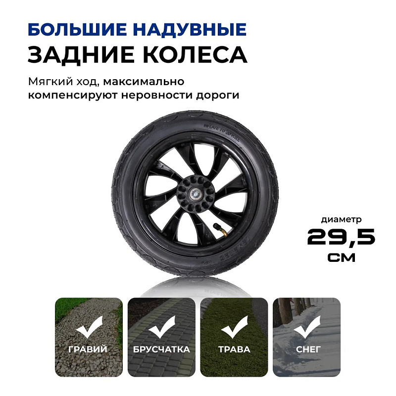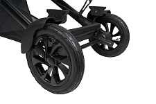 - материал колёс: передние EVA, задние надувные. Колеса съемные, что облегчает уход за коляской. Передние колёса поворотные с фиксацией, что обеспечивает лучшую маневренность и удобство при использовании. На задних колёсах предусмотрены брызговики.