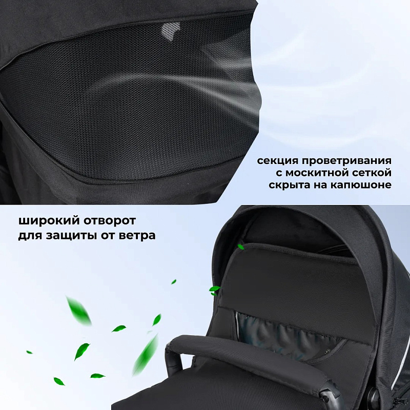 - капюшон со скрытой секцией из москитной сетки на молнии. Для наблюдения за малышом также есть окошко на магните. Для безопасности в темное время суток по периметру капюшона расположена светоотражающая лента;