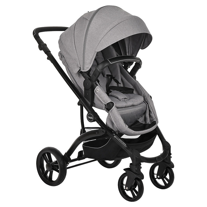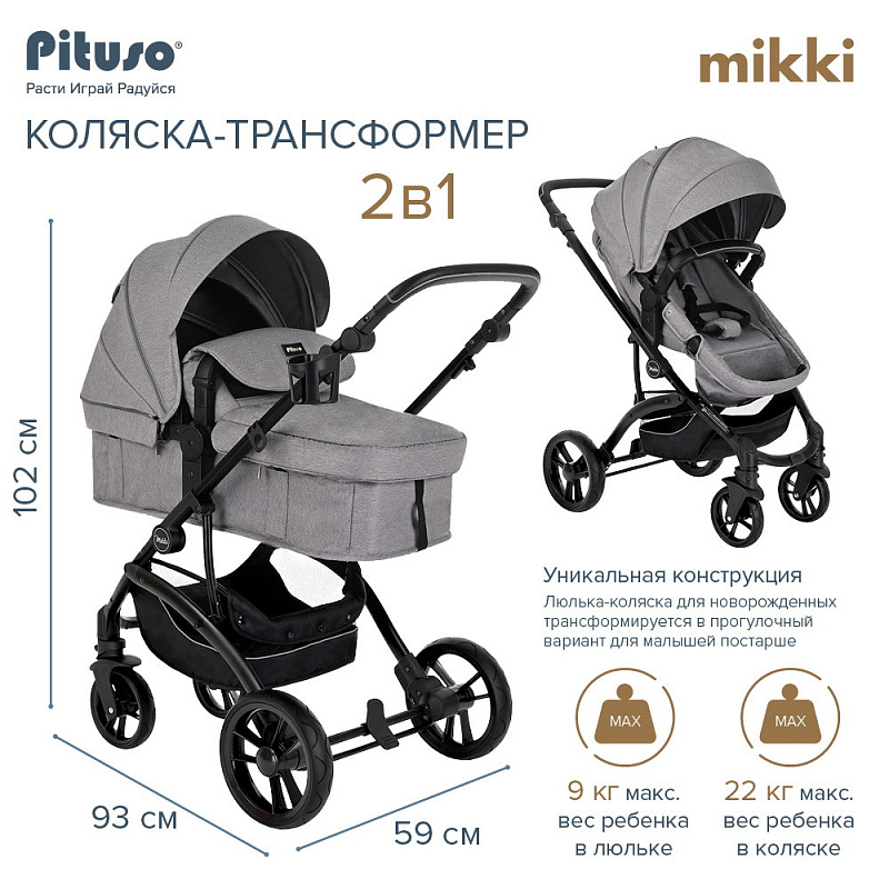 Коляска-трансформер Mikki подходит для малышей с рождения. Всего один блок имеет два варианта трансформации: уютная люлька для новорождённого и прогулочный вариант для ребёнка постарше. Блок можно устанавливать по ходу движения и лицом к родителям. Угол наклона блока регулируется ручкой – подходящее положение настраивается за секунду. Наклон спинки необходимо дополнительно отрегулировать ремнем. Надёжные износостойкие колёса с покрытием PU не требуют подкачки и снабжены амортизаторами – ребёнок будет сладко спать даже в прогулках по неровной дороге. Для максимальной манёвренности передние поворотные колёса имеют возможность фиксации направления. Ножной тормоз в мгновение останавливает оба задних колеса. Большой козырёк защитит малыша от ярких солнечных лучей и ветра, а смотровое окошко на капюшоне позволит всегда быть в поле зрения мамы. В большую корзину поместится всё необходимое – не нужно нести покупки или игрушки в руках. Вариант с люлькой рассчитан на детей от 0-9 кг, с прогулочным блоком от 7 до 36 мес