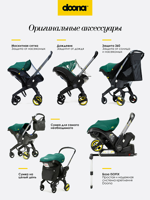 - Помимо вкладыша, руководствуясь идеей эргономичности и комфорта, компания разработала широкий набор аксессуаров для Doona Plus, которые сделают ее эксплуатацию еще более простой и комфортной.