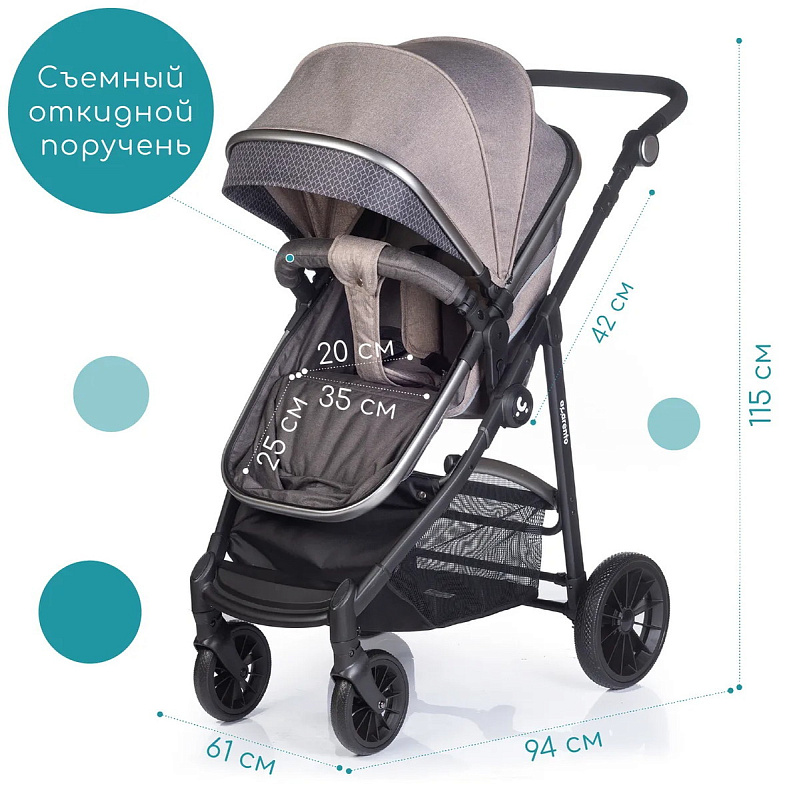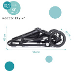 Размер коляски в разложенном виде составляет 94х61х115 см (ДхШхВ), в сложенном виде — 95х61х42 см, размер спального места — 82х35 см, высота от пола до сиденья — 56 см, ширина сиденья — 35 см, длина сиденья — 20 см, высота спинки — 42 см, высота до ручки — 89–115 см, ширина передней оси — 34 см, ширина задней оси — 61 см, диаметр передних колёс — 17 см, диаметр задних колёс — 24 см, а вес составляет 10,2 кг.