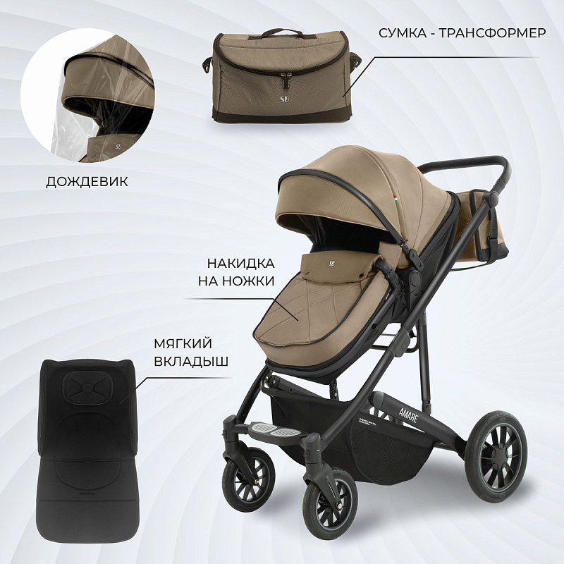Коляска легко складывается одной рукой и может храниться в вертикальном положении. В комплект входит тёплый чехол на ножки и дождевик, что делает Sweet Baby Amare ещё более практичным и удобным выбором для родителей.