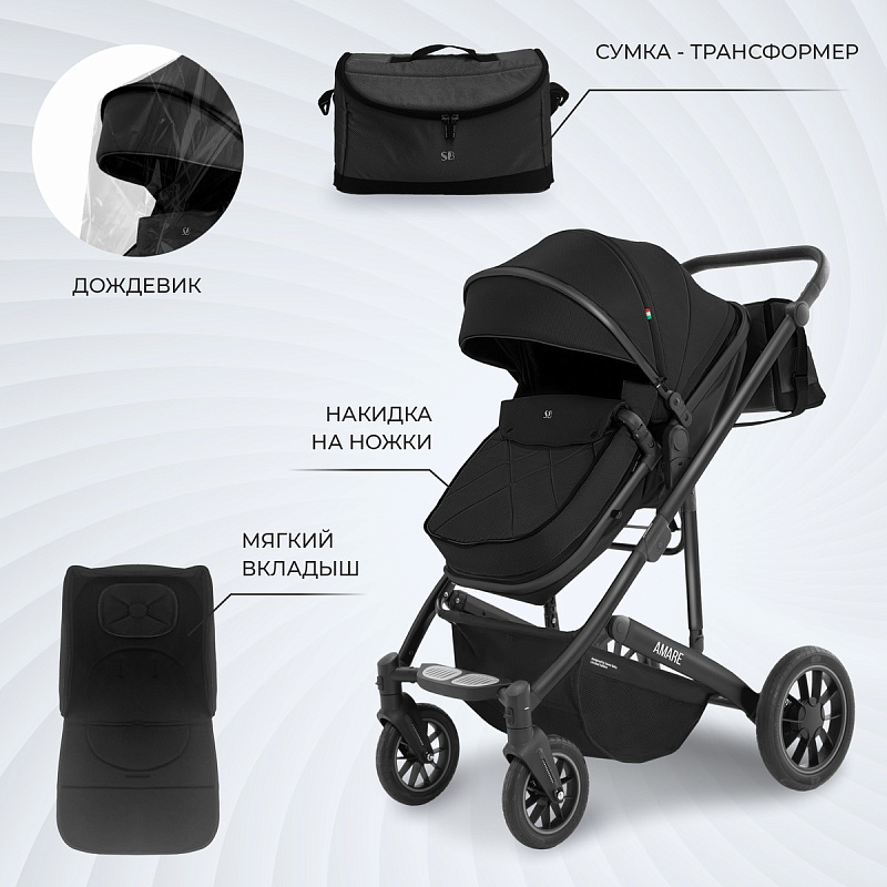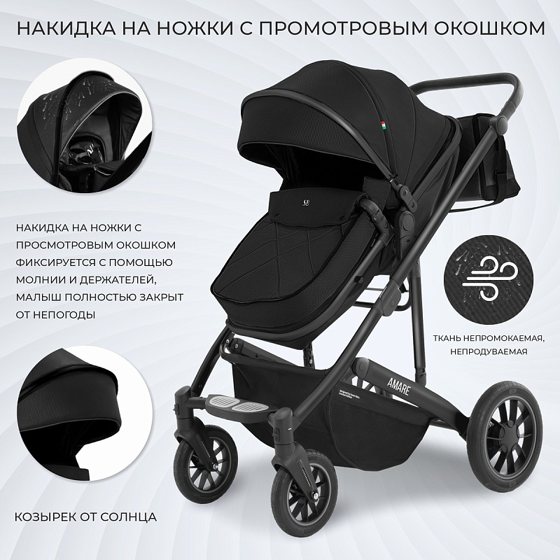 Коляска легко складывается одной рукой и может храниться в вертикальном положении. В комплект входит тёплый чехол на ножки и дождевик, что делает Sweet Baby Amare ещё более практичным и удобным выбором для родителей.