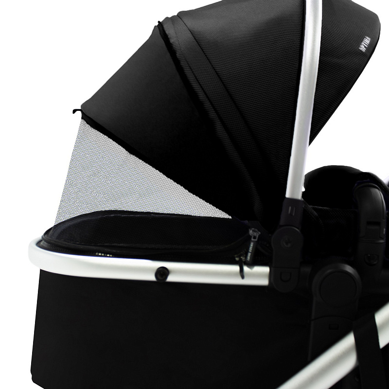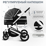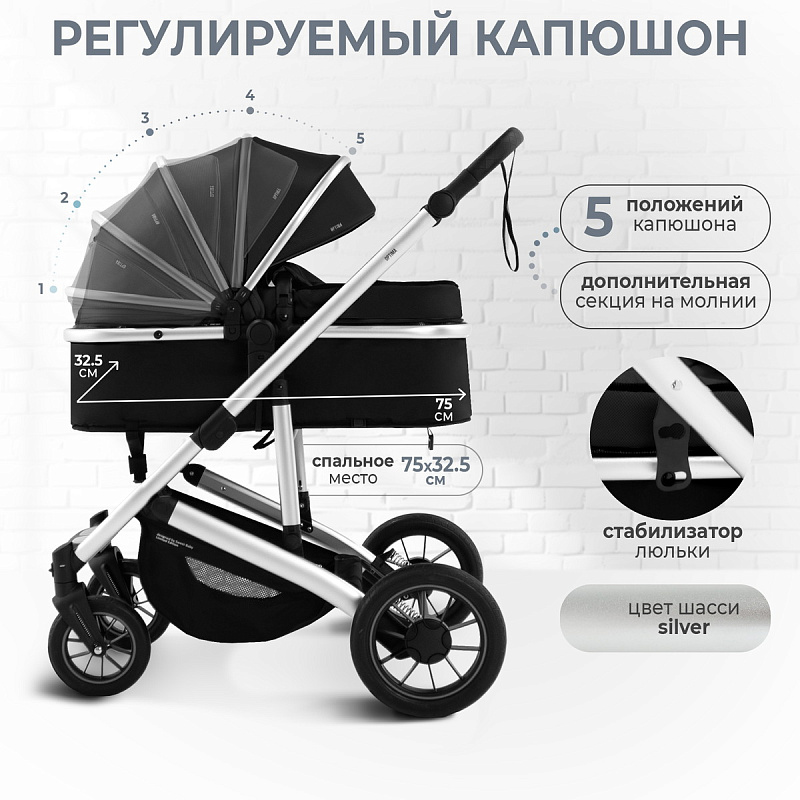 • раздвижной капюшон, регулируется в 5 положениях - произведен из ткани, защищающий от УФ лучей (UPF 50+), полностью закрывает малыша;