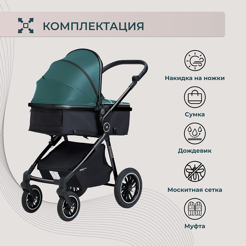 В комплекте: анатомический матрасик, сумка для мамы, дождевик, москитная сетка и муфта для рук.