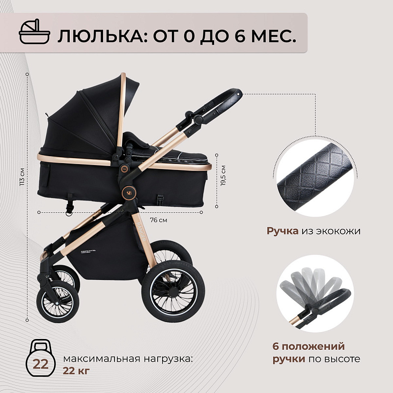 максимальная нагрузка 22 кг + 3 кг корзина;6 положений регулировки родительской ручки;8 положений регулировки капора.