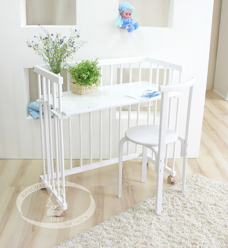 - Примечательно то, что когда малыш вырастет из колыбели, она может легко трансформироваться в столик и стульчик для ребенка.