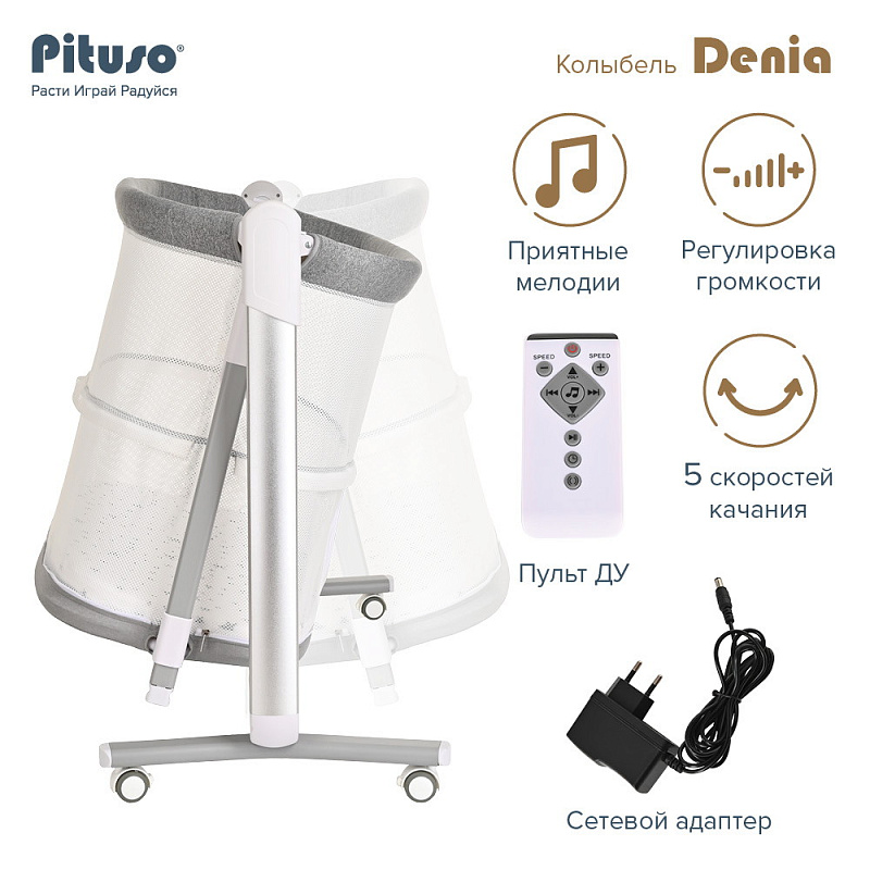 Pituso Denia в качестве электроколыбели будет раем для вашего малыша. Она имеет 5 скоростей качания, таймер на 8, 15, 30 минут, музыкальное сопровождение с регулировкой громкости. Для удобства в комплекте идет пульт дистанционного управления. Можно не беспокоиться о самочувствии младенца во время сна, ведь колыбель имеет систему индукционного качания, что успокоит малыша, даже если он неожиданно проснется.