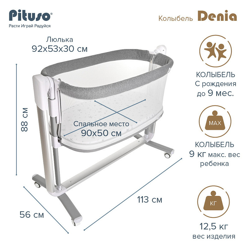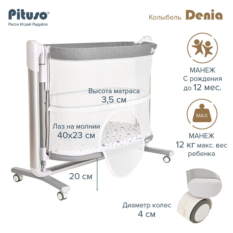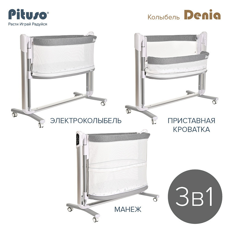 Колыбель Pituso Denia сочетает в себе сразу 3 функции: приставная кроватка, электроколыбель и манеж. Предназначена для детей с первых дней жизни до достижения веса 9 кг и до достижения веса 12 кг используется в качестве манежа.