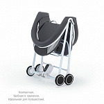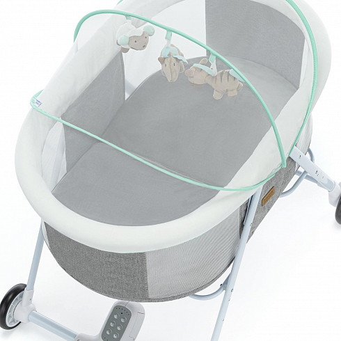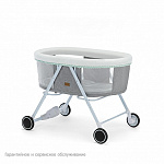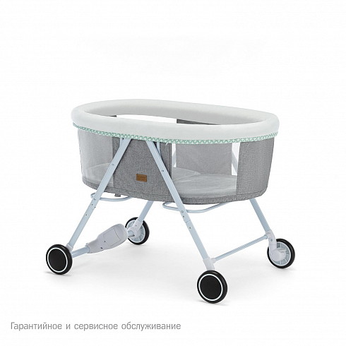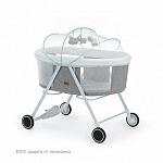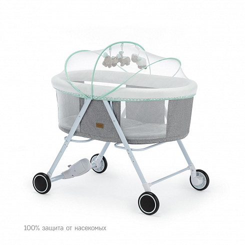 Колыбель оснащена автоматической системой укачивания. Быстро и практично складывается для транспортировки, удобна в путешествии. Модель можно использовать на открытом воздухе, а москитная сетка защити малыша от насекомых. Каркас изготовлен из трубчатого стального профиля, который покрыт порошковой краской. Детали из ударопрочного пластика. Верхняя часть каркаса дополнена мягкой противоударной накладкой. Колёсики изделия имеют стопоры, позволяющие зафиксировать колыбель в неподвижном состоянии.