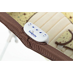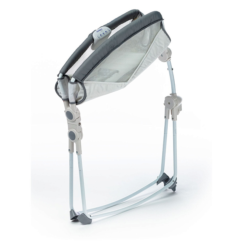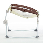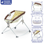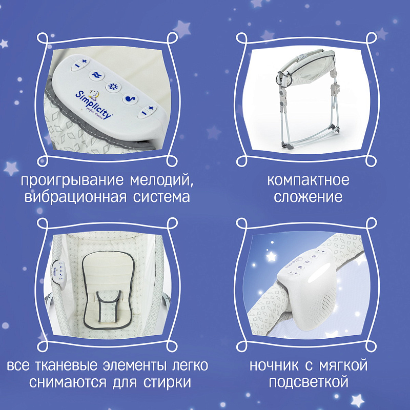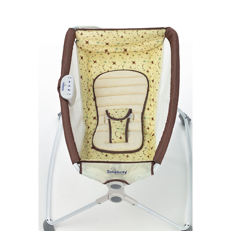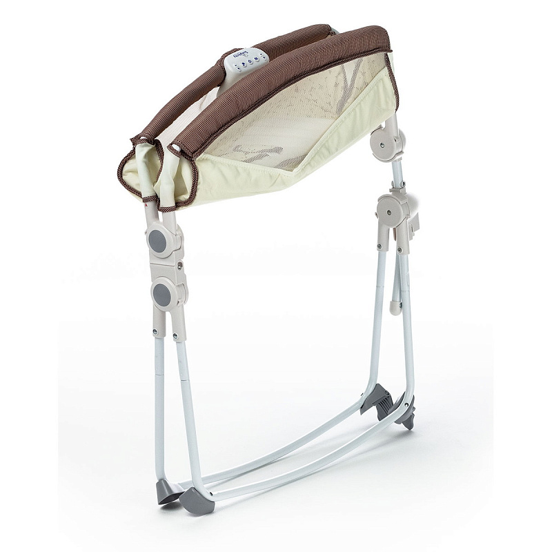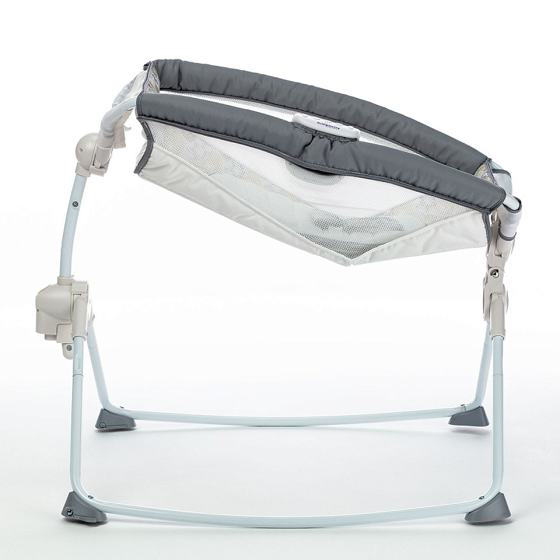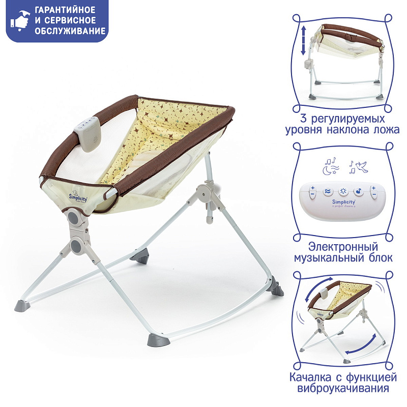 Колыбель имеет анатомически правильное основание. Необходимую жесткость обеспечивает специальная пластиковая вставка под чехлом. Для дополнительного комфорта малыша предусмотрен мягкий вкладыш, идеально повторяющий форму тела ребенка. Сетчатые вставки по бокам служат для хорошей циркуляции воздуха, а изогнутые (дугообразные) ножки удобны для плавного качания. Нежный режим вибрации поможет малышу расслабиться, а колыбельные мелодии подарят ему спокойный сон.
